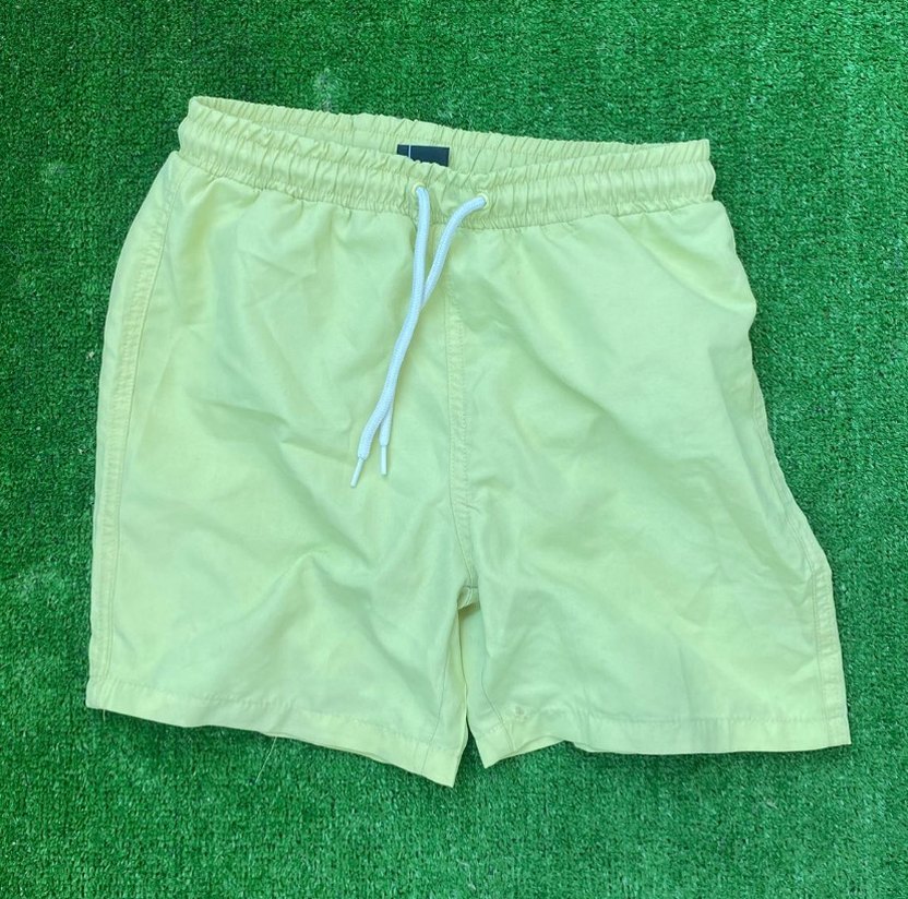 Pastel sarı renkte, bol kesim ve kısa boy erkek mayo şortudur. Elastik bel ve ayarlanabilir bağcıkla rahat kullanım sağlar. Düz ve sade tasarımıyla plaj ve sokak stiline uygundur.