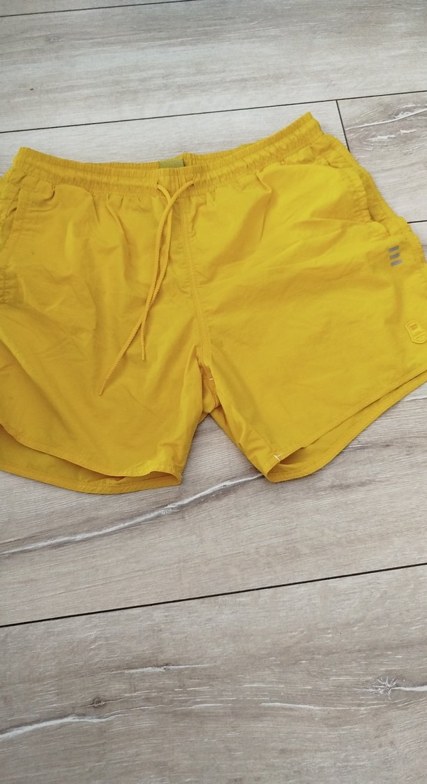 Parlak sarı renkte, mini boy ve rahat kesim erkek deniz şortu. Desensiz, sade tasarımıyla sokak stiline uygun, plaj için ideal şort.