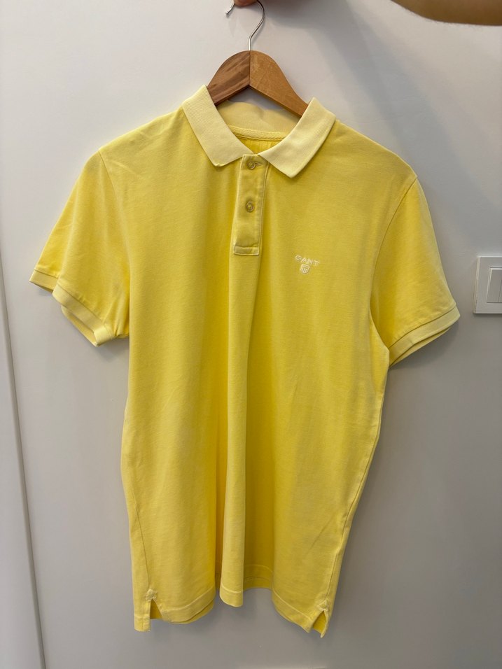 Sarı renkli erkek polo tişört, kısa kollu ve düğmeli yakaya sahiptir. Pamuklu kumaştan yapılmış, rahat ve günlük kullanıma uygun dar kesim bir tasarımdır.