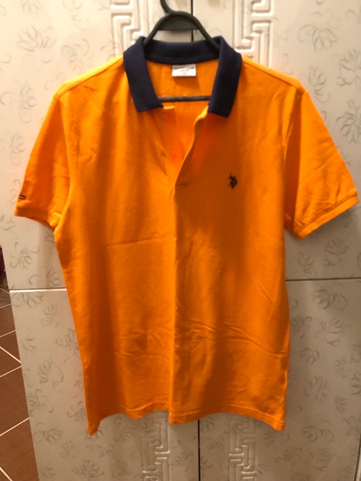 Koyu yakalı, kısa kollu sarı erkek polo tişörtü. Rahat kesimli, sentetik dokulu kumaştan, günlük sokak giyimine uygun. hİÇ GİYİLMEDİ ufak iki leke var yıkayınca çıkar bilerek alınız