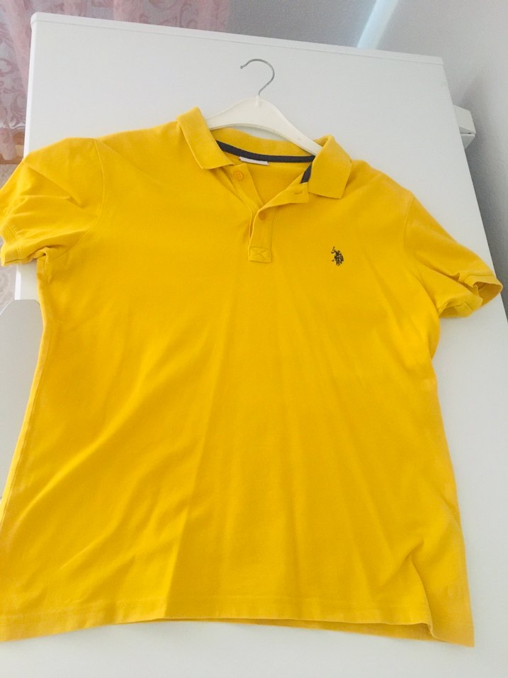 Erkekler için polo yaka, kısa kollu, parlak sarı renkte ve sentetik kumaştan üretilmiş, rahat kesim tişört. Günlük ve sokak stiline uygundur. Hiç kullanılmadı