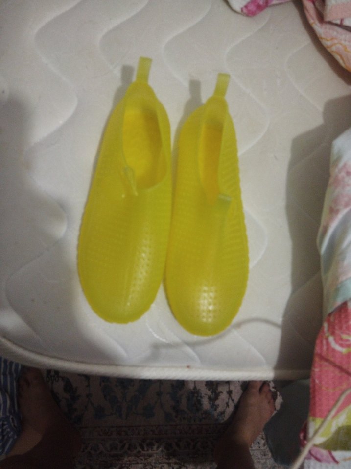 Sarı renkte, lastik malzemeden yapılmış, Velcro bantlı erkek su ayakkabısı. Plaj kullanımı için uygundur, minimalist ve sade tasarıma sahiptir.