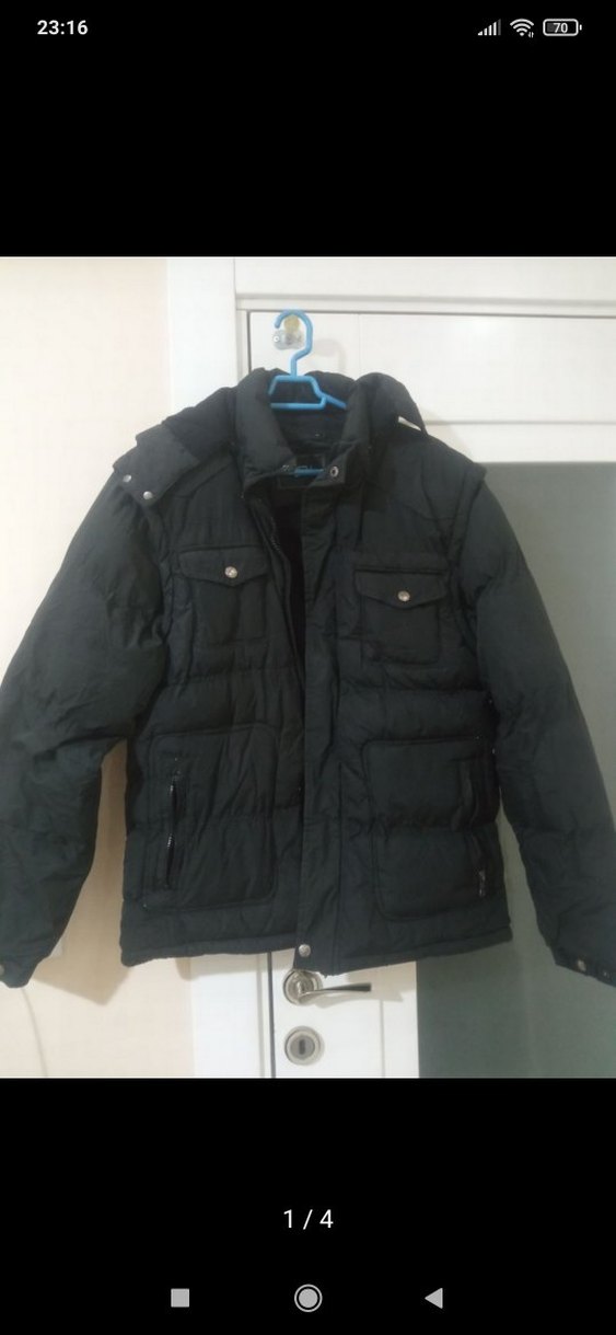 bir kez giyildi hiçbir sorunu yoktur L beden kolları ve kapşonu çıkarılarak da yelek şeklinde kullanilabilir