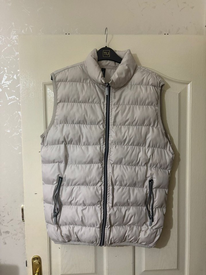Fermuarlı cepleri ve yüksek yakasıyla bej renkli, orta boy, vücuda oturan kadın yelek. Yumuşak ve sıcak kumaştan üretilmiştir. erkek yelek xl beden yırtik yeri yoktur