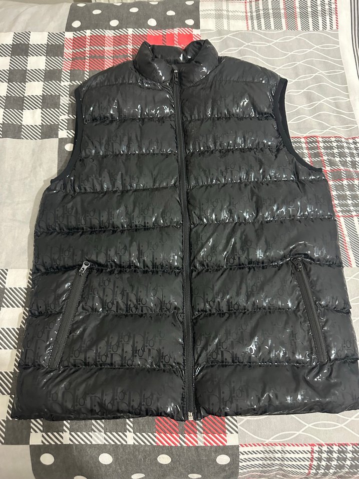 Erkekler için siyah, parlak sentetik kumaştan yapılmış, fermuarlı cepli, yüksek yakalı, dar kesim şişme yelek. Sokak stili ve günlük kullanıma uygun.Dior marka ama orijinal değil!!!