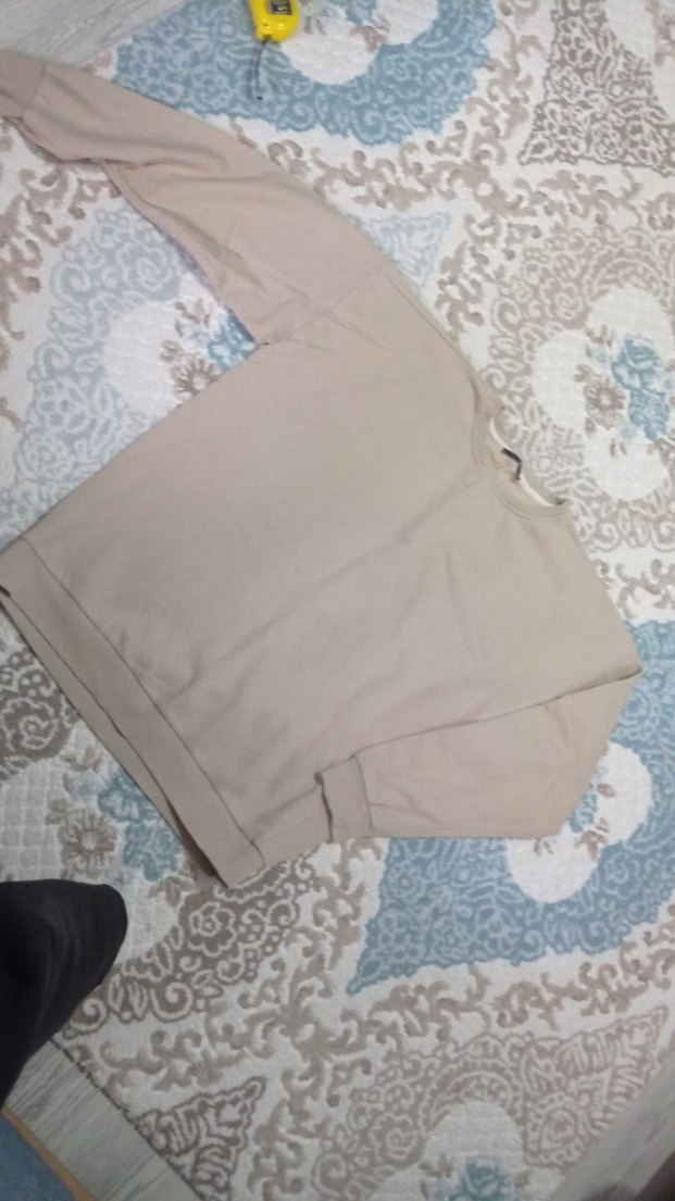 Bej pamuklu sweatshirt, rahat kesim ve yuvarlak yaka ile. Uzun kollu, normal boyda, günlük rahat kullanım için uygun. 90_100kilo giyebilir