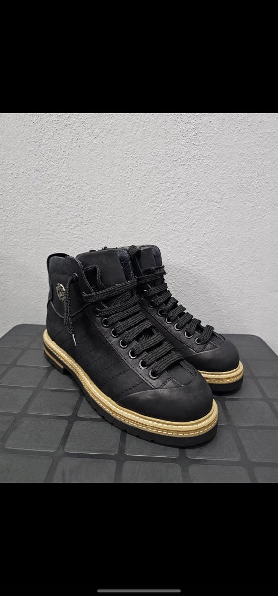 Erkekler için siyah, tokalı ve bağcıklı sokak stili botlar. Koyu renkte, desensiz ve kalın tabanlı sağlam yapıya sahip.