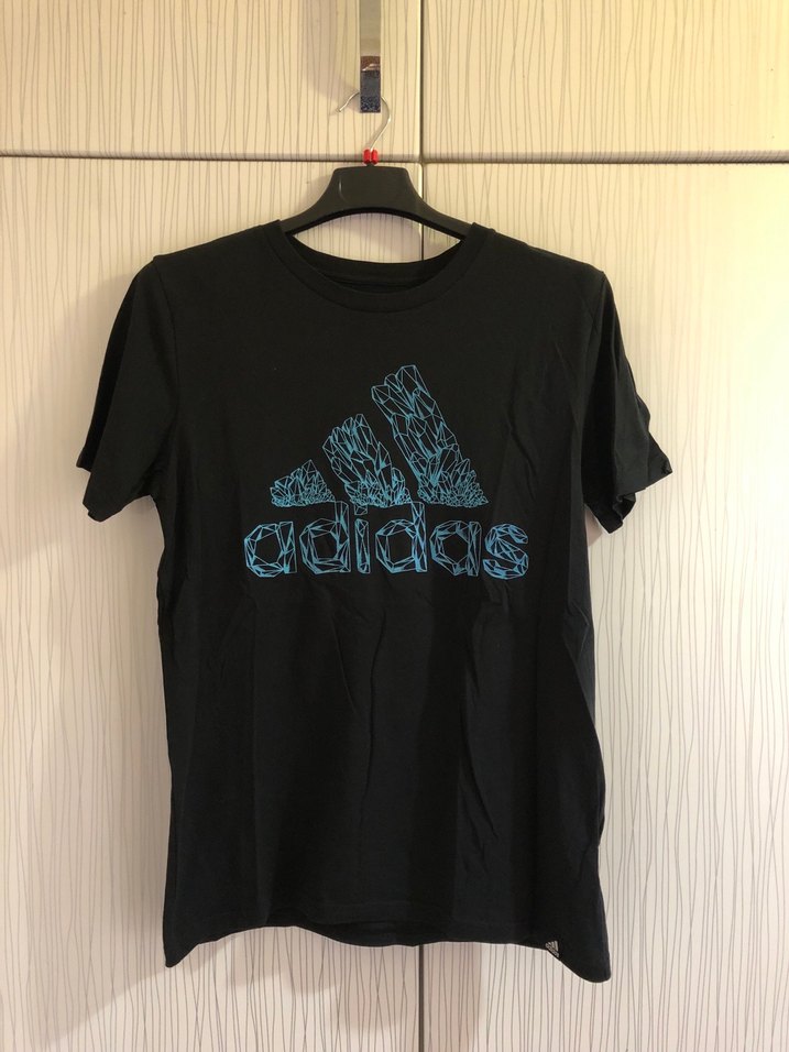 Siyah Adidas baskılı erkek tişörtü, bol kesim, kısa kollu ve mavi baskılı logo detayıyla. Bisiklet yaka ve cırt cırtlı özelliğe sahip, sokak stili için uygun.