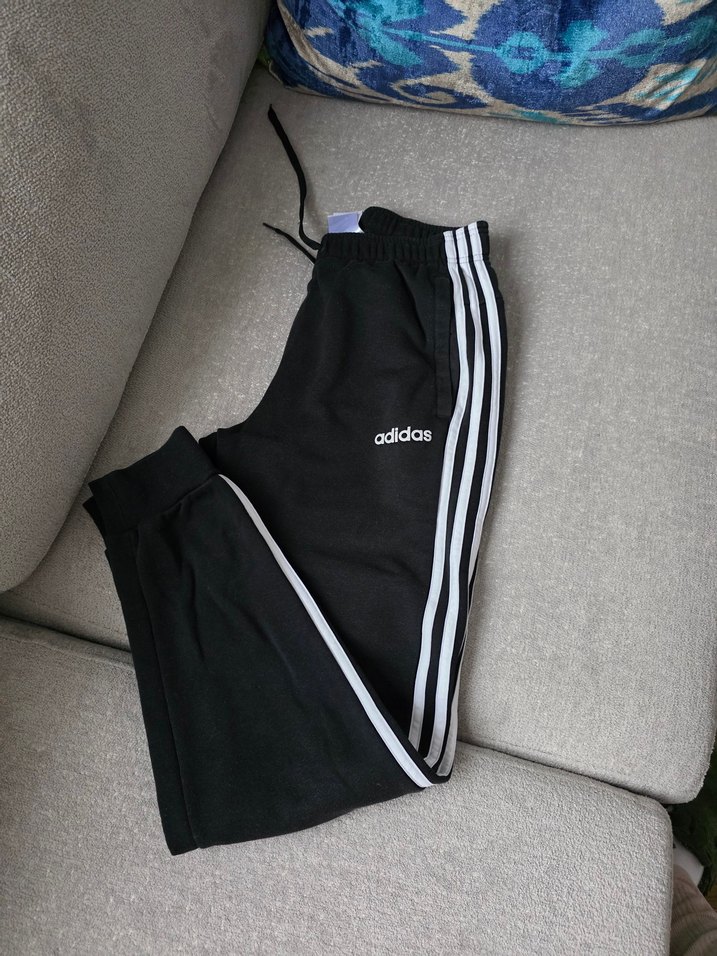 Siyah renkli Adidas marka, yanları çizgili, normal boy pamuklu eşofman altı. Elastik bel bantlı, spor ve günlük kombinlere uygun.