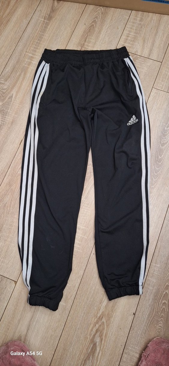 Siyah, bol kesim erkek eşofman altı, elastik bel ve bilek kısmı ile Adidas yan şeritlerine sahip. Rahat sentetik kumaştan üretilmiştir.