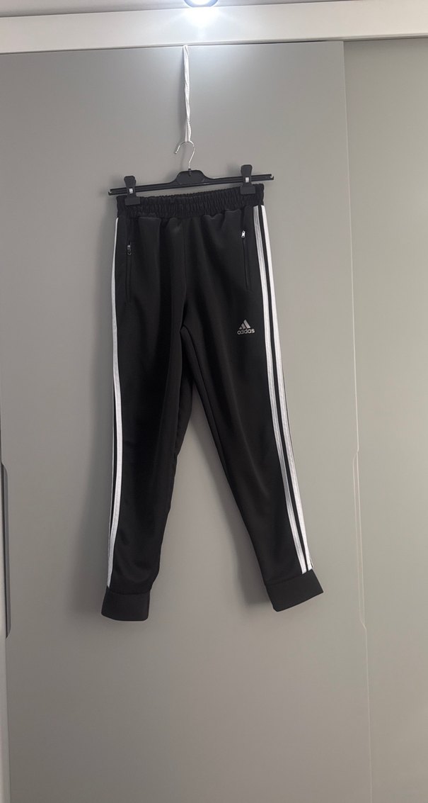 Erkekler için siyah Adidas eşofman altı, bol kesim ve fermuarlı cepler içerir. Yumuşak ve sıcak kumaştan yapılmış, beyaz yan şeritlere ve rahat elastik bele sahiptir.