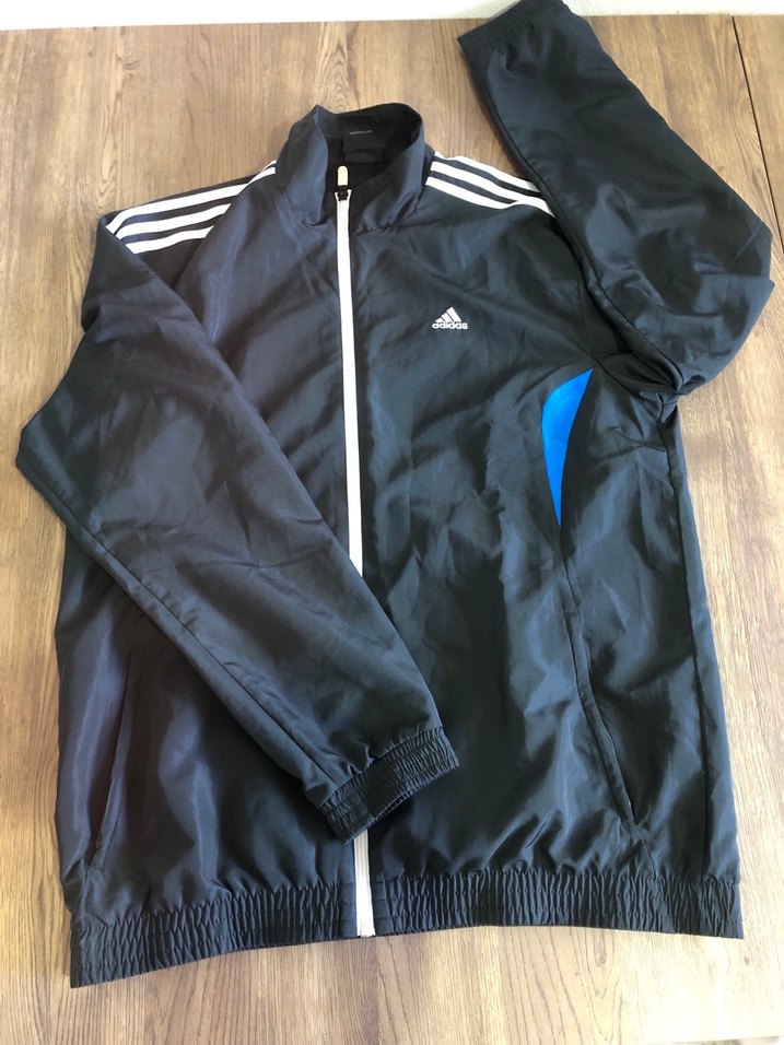 Erkekler için siyah Adidas yağmurluk, fermuarlı ve yüksek yakalıdır. Uzun kollu, yanlarda mavi detaylı cepleri vardır. Hafif sentetik kumaştan üretilmiştir. ️ Beden:M En:58 Boy:72