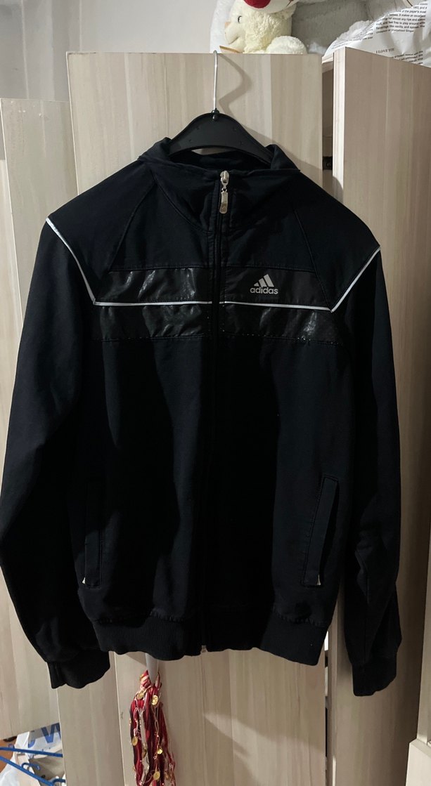 Bu erkek siyah Adidas yağmurluk, fermuarlı ve yüksek yakalıdır. Sentetik kumaştan üretilmiş, dar kesim ve uzun kolludur. Dış mekan kullanımı için uygundur ve sokak stiliyle uyumludur. ️