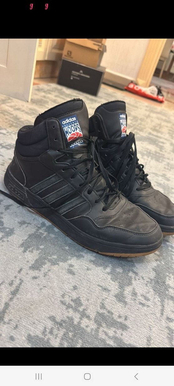 Bu siyah Adidas erkek spor ayakkabıları bağcıklı tasarıma ve kauçuk tabana sahiptir, sportif sokak giyimi için uygundur. Koyu ve desensiz şık bir görünüme sahiptir. 44,5 numara