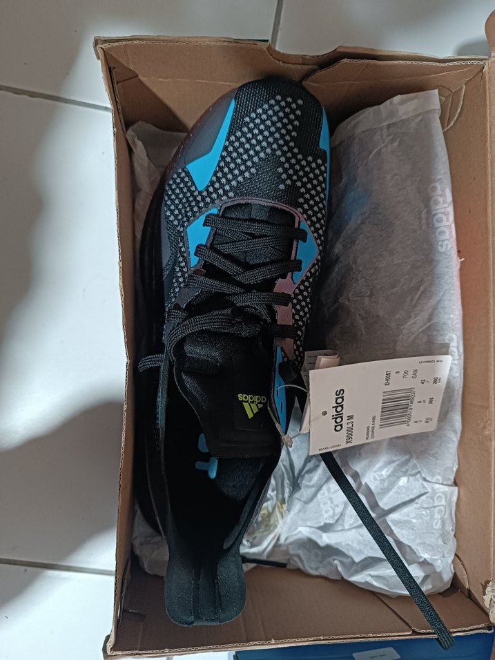 Siyah renkli Adidas erkek spor ayakkabısı, baskılı desenli ve bağcıklı tasarıma sahip, dayanıklı kauçuk malzemeden üretilmiştir.