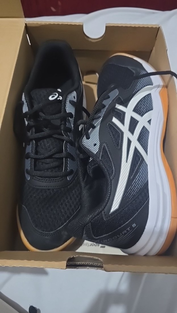 Spor ve sokak tarzı için elastik özellikli, kauçuk tabanlı, baskılı desenli siyah Asics erkek koşu ayakkabısı. (voleybol ayakkabısı)