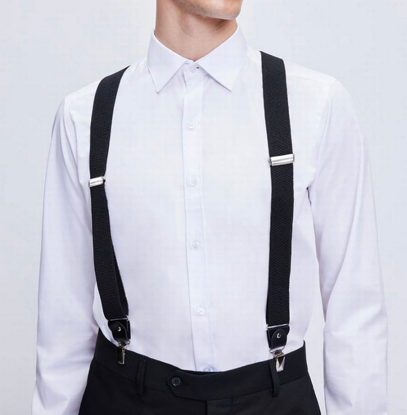 Ayarlanabilir kayışları ve metal klipsleri olan siyah erkek pantolon askısı, trend bir günlük tarz için uygundur.