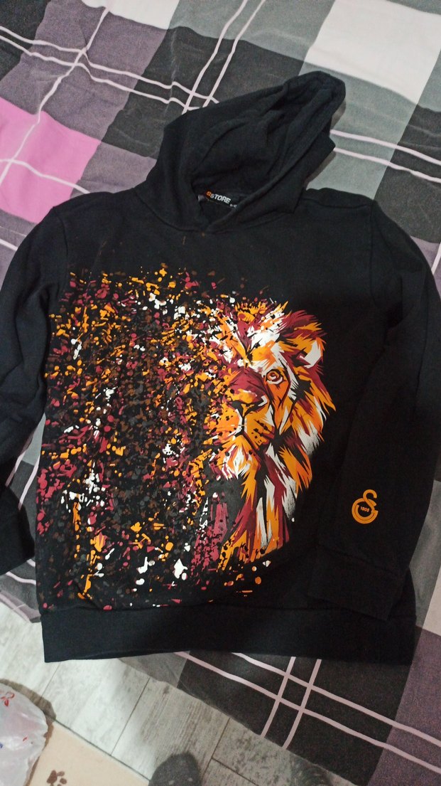 Siyah erkek sweatshirt, aslan baskısı ve kürk detaylı. Uzun kollu, bisiklet yaka ve bol kesimdir, günlük rahat stil için uygundur.