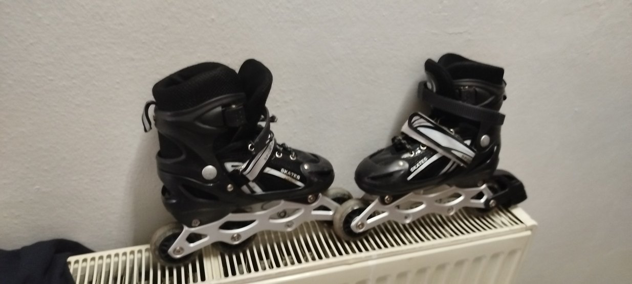 Spor ve athleisure için siyah, bağcıklı, biker tarzı erkek paten. Kauçuk malzemeden yapılmış, desen içermeyen koyu renkte ve sağlam tekerlekli. ⛸️