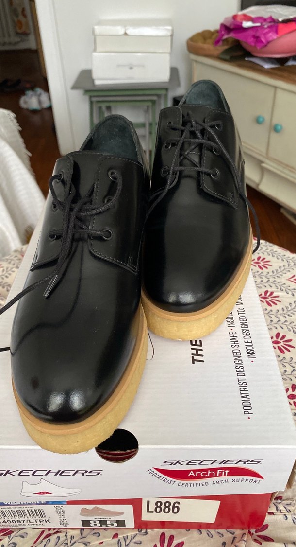 Siyah deri erkek ayakkabılar, koyu renk bağcıklar ve açık renkte taban ile, düz yüzeyli ve bağcıklı tasarıma sahip.