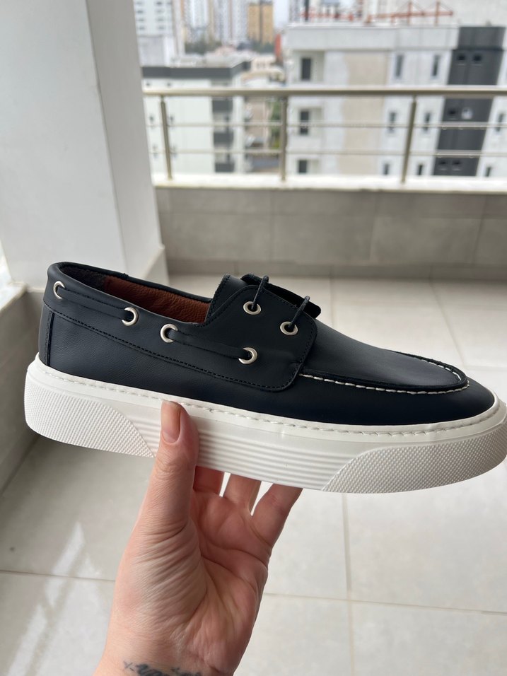 Erkekler için bağcıklı siyah günlük spor ayakkabı, beyaz kalın kauçuk tabanlı. Sokak stiline uygun sade ve şık tasarım.