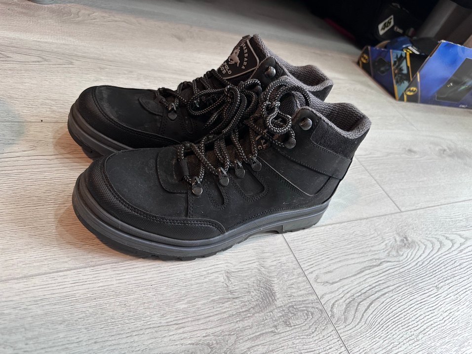 Siyah kauçuk erkek bot, bağcıklı tasarımla. Günlük kullanım için uygun, trend sokak modasına uygun, desensiz koyu renkte. 1-2 defa kullanıldı çok temiz