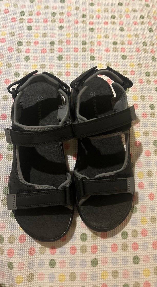 Siyah kauçuk tabanlı, tokalı bantlara sahip erkek sandalet. Minimalist tarzda, dış mekan ve günlük kullanıma uygun rahat bir model. Hiç giyilmedi