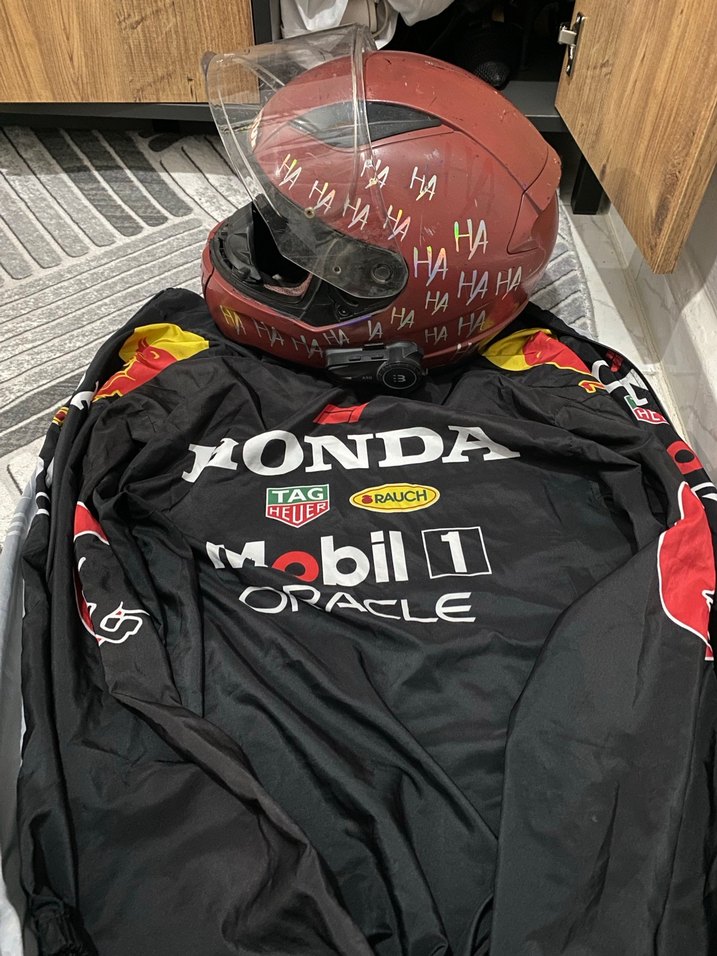 Erkekler için siyah baskılı, sentetik kumaştan, uzun kollu, bisikletçi tarzı, normal boyda, velcro detaylı ceket. Honda, Mobil 1 ve Oracle baskıları bulunur. ️