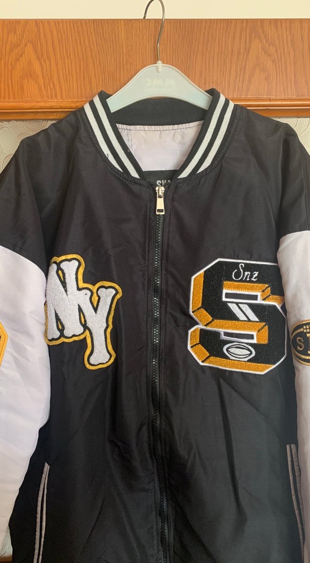 Siyah baskılı, fermuarlı, bol kesim erkek ceketi. Sentetik kumaştan, bisiklet yaka ve rahat sokak stili görünümüne sahip.