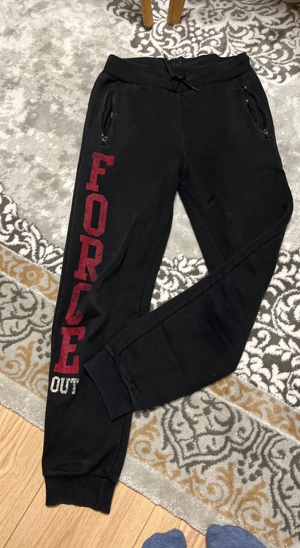 Siyah, baskılı ve fermuarlı cepli, bol kesim kadın eşofman altı. Spor ve sokak stili için uygundur.