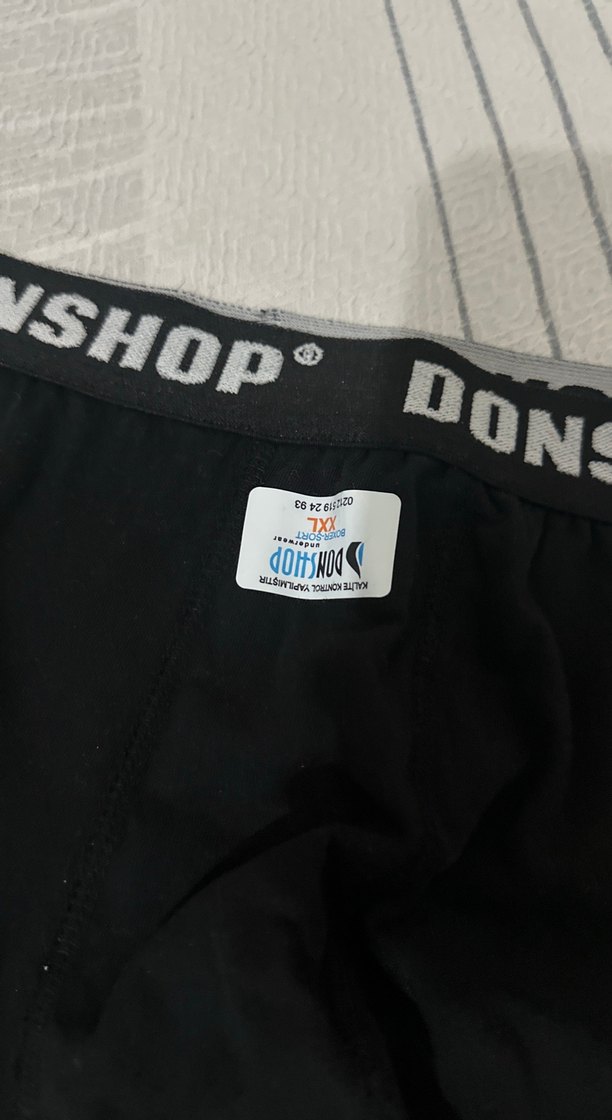 Erkekler için siyah renkli, baskılı ve fitted kesim boxer. Orta boy uzunlukta olup bel kısmında DON ve VSHOP markaları yer alır.