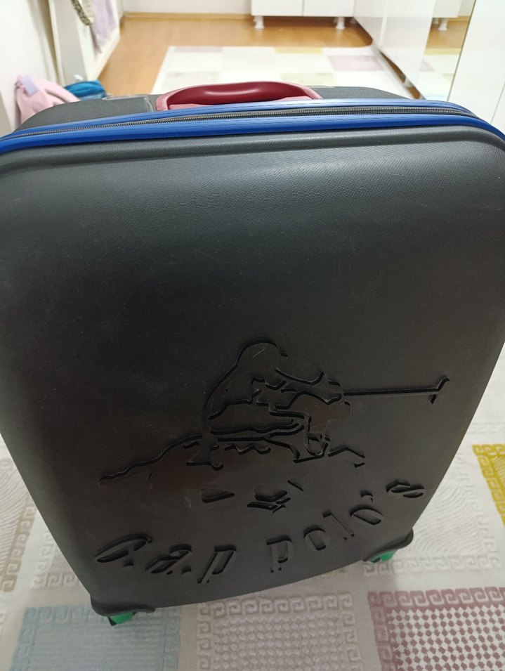 Erkekler için siyah renkli, baskılı bisikletçi desenli ve kemerli detaylara sahip sade ve minimalist tarzda bavul.