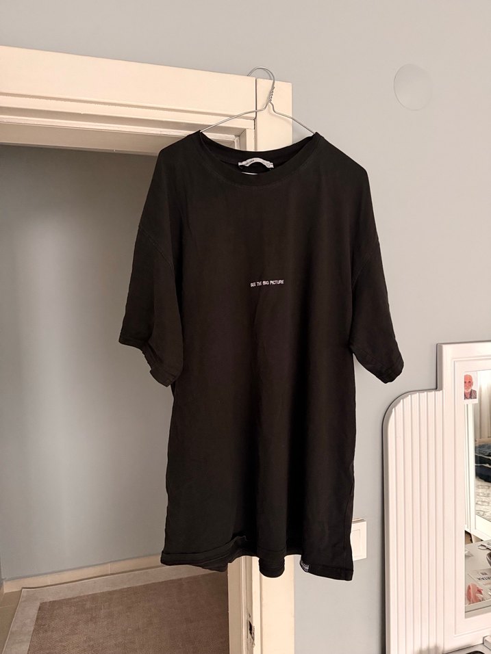 Erkekler için siyah keten tişört, kısa kollu, yuvarlak yakalı ve rahat kesim, minimal baskılı tasarımla günlük sokak stiline uygundur. Tişört XL BEDEN ÇOK NADİR GİYİLDİ grimelange marka