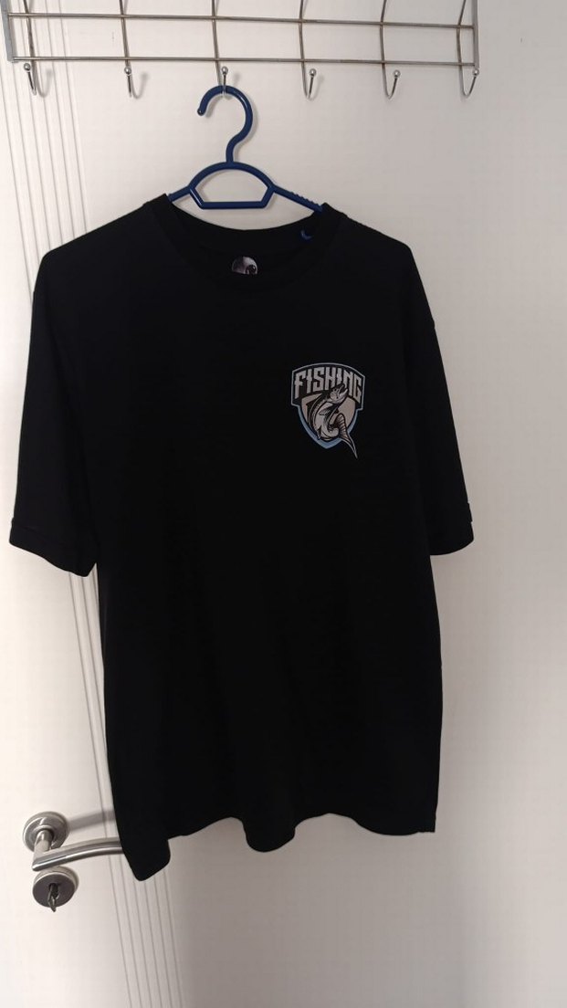 Yumuşak ve sıcak kumaştan, baskılı balıkçılık desenli, kısa kollu, oversize siyah tişört. Omuzda cırt cırt detaylı, spor sokak tarzı için uygun.