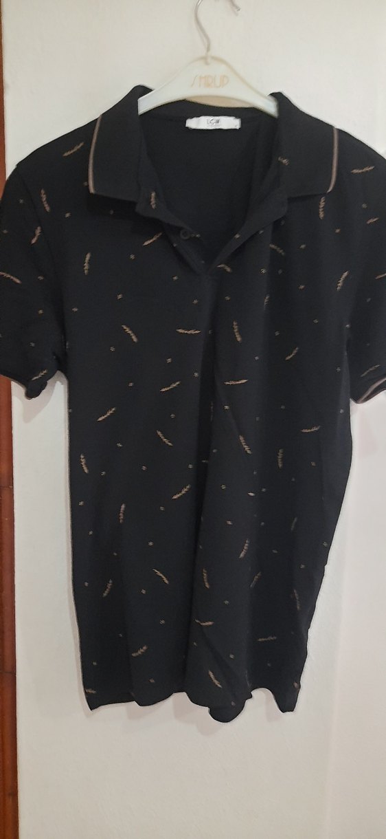 Erkekler için siyah baskılı polo tişört, yakalı ve düğmeli. Kısa kollu, bol kesim, gündelik sokak tarzına uygun. olculeri paylaştım iki kol arası 52cm civari.