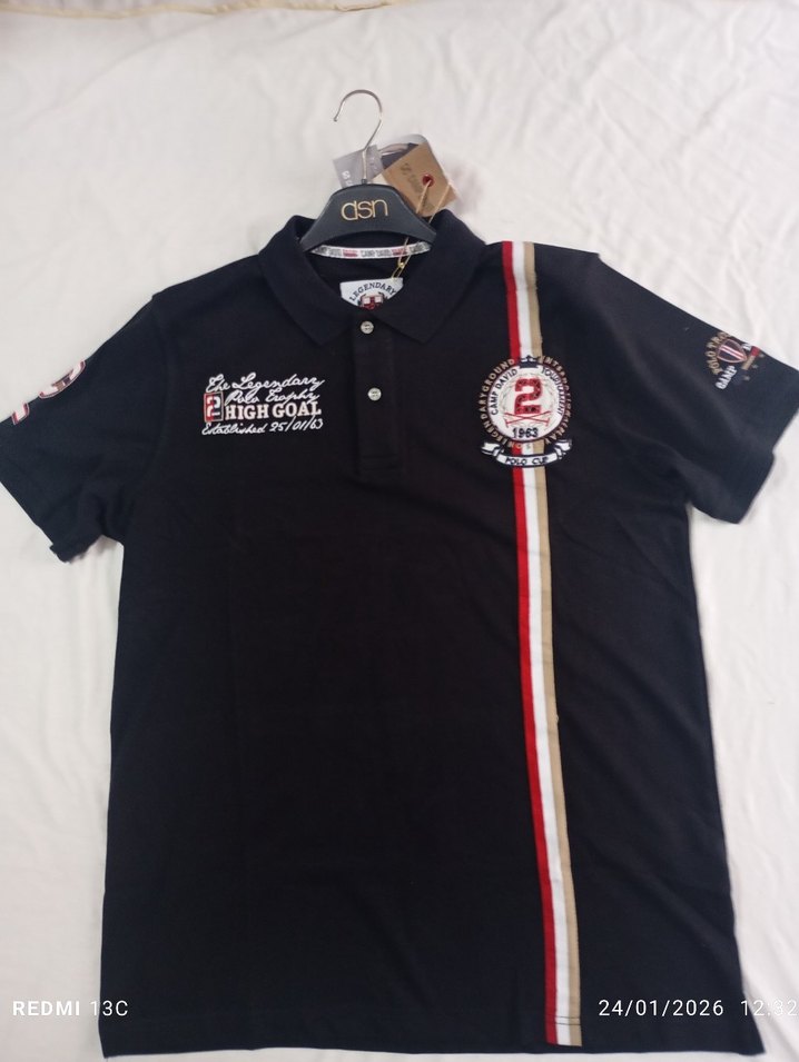 Erkek siyah polo tişört, kısa kollu ve yakalıdır. Butonlu, baskılı tasarımlı, spor çizgiler ve yamalar içerir. Sentetik kumaştan, regular fit, athleisure tarzında.