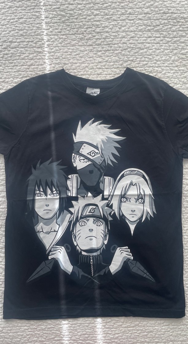 Siyah, bol kesim kısa kollu tişört, baskılı anime karakterleriyle. Bisiklet yaka ve sokak modası tarzında, rock punk havası verir.