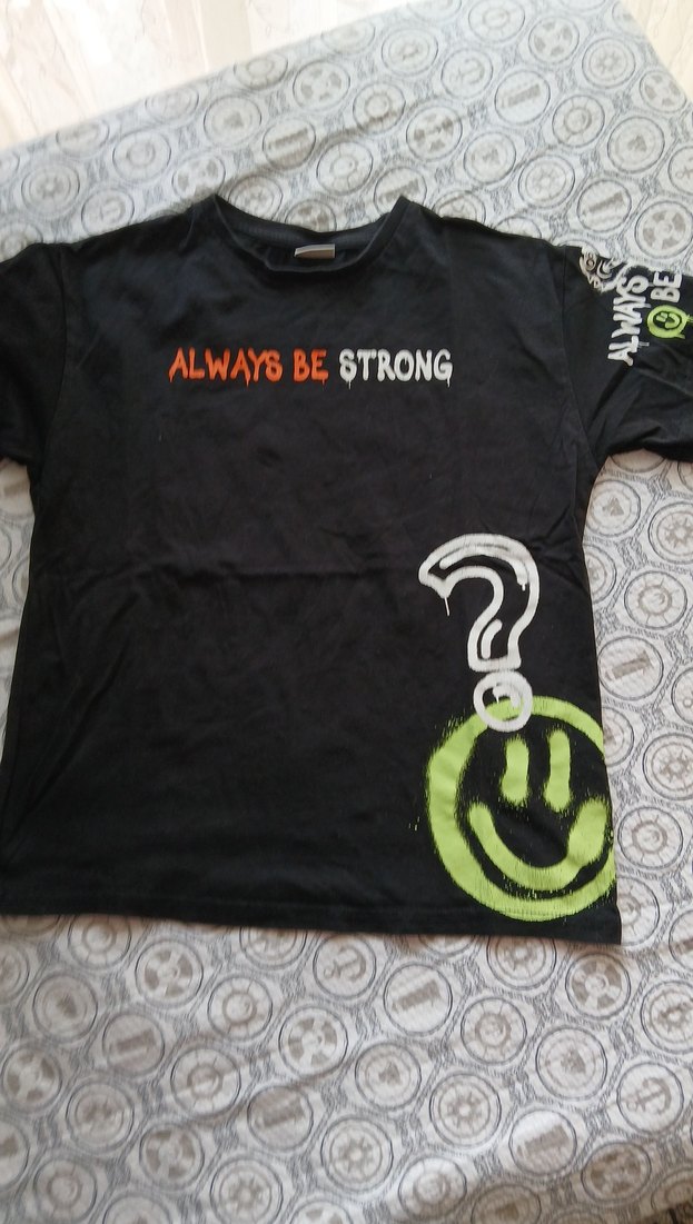 Siyah, bol kesim, kısa kollu, bisiklet yaka erkek tişörtü, düğmeli ve "ALWAYS BE STRONG" yazılı baskılı tasarıma sahip.