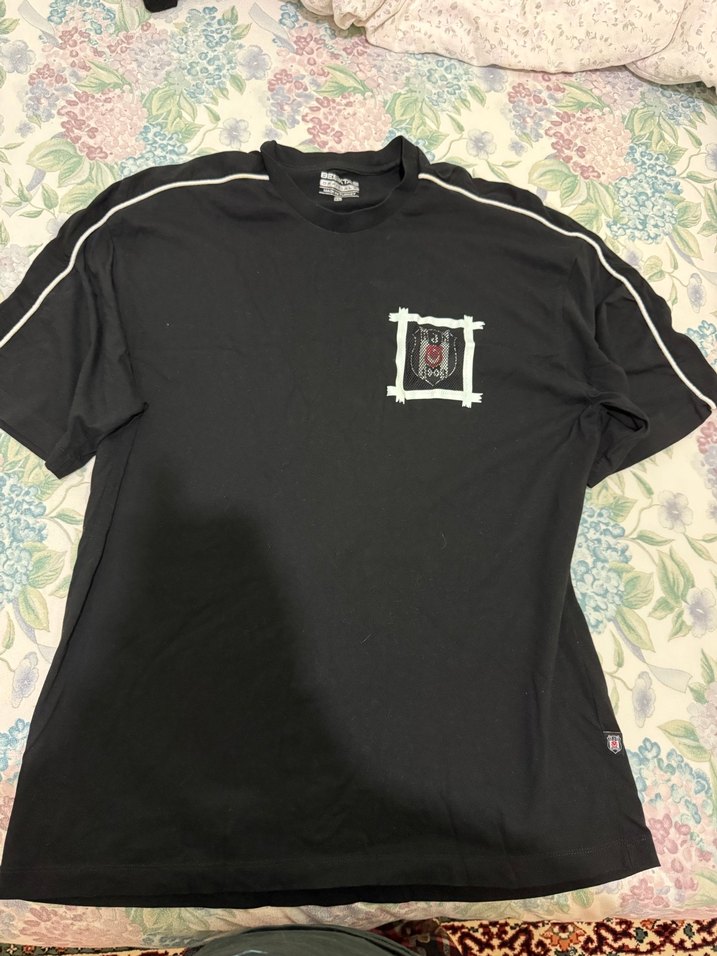 Erkekler için siyah pamuklu, kısa kollu, bisiklet yakalı ve bol kesim tişört. Omuzlarda beyaz çizgiler ve baskılı detaylar bulunur. Spor ve günlük kullanıma uygundur.