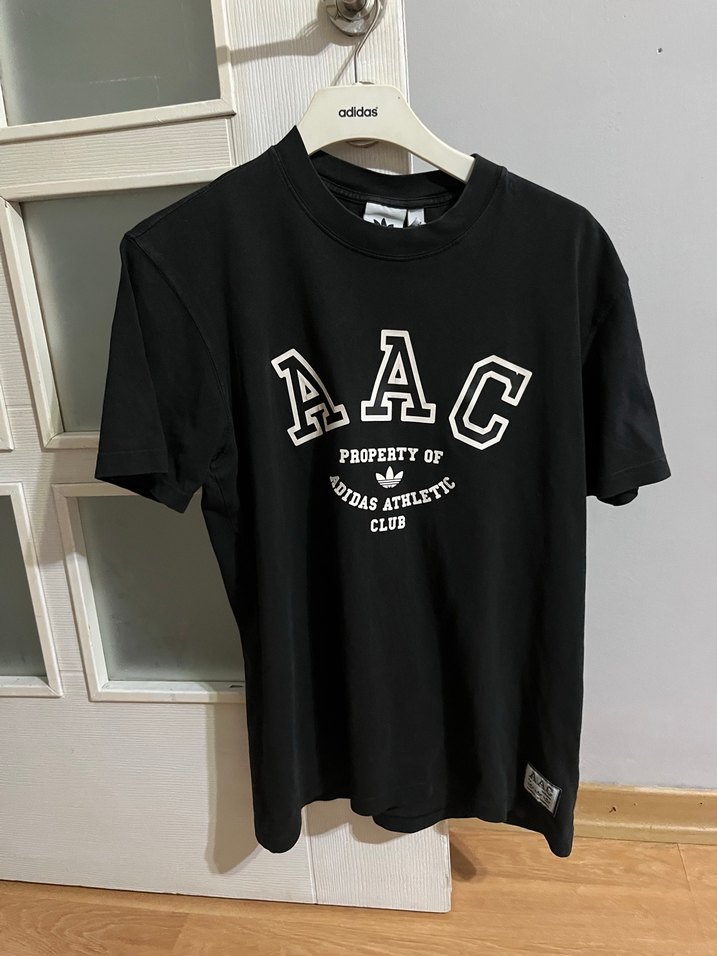 Erkek giyim için pamuklu, kısa kollu, yuvarlak yaka ve bol kesim siyah tişört. Ön kısmında Adidas Athletic Club yazılı baskı bulunur.