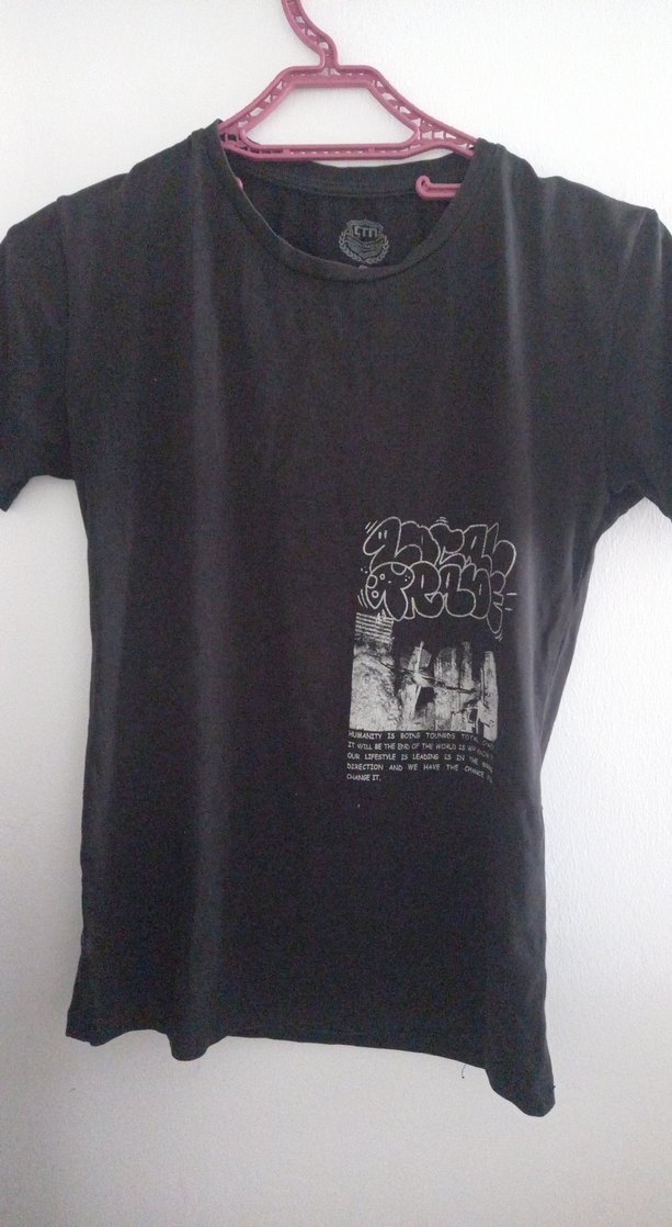 Pamuklu, siyah renkli, baskılı ve oversize tişörtü. Kısa kollu ve bisiklet yaka, rock punk tarzı yansıtıyor.