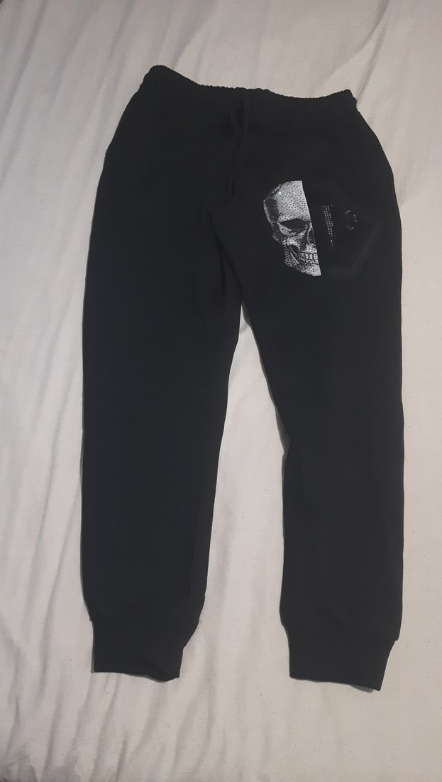 Erkekler için siyah, baskılı kafatası desenli, rahat kesim ve fermuarlı ceplere sahip eşofman altı.