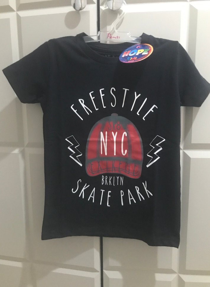 Dar kesim siyah erkek tişört, kısa kollu ve bisiklet yaka. 'NYC' ve 'BRKLYN' baskılı, tokalı detaylı rock punk tarzı. Harika pamuklu kumaş