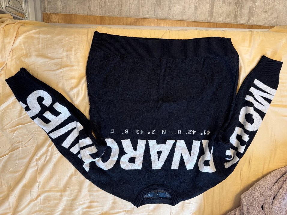 Siyah, pamuklu, uzun kollu, bol kesim triko sweatshirt. Bisiklet yaka ve baskılı desen içerir, günlük sokak stiline uygun. Az giyilmiştir. M beden bershka orjinal