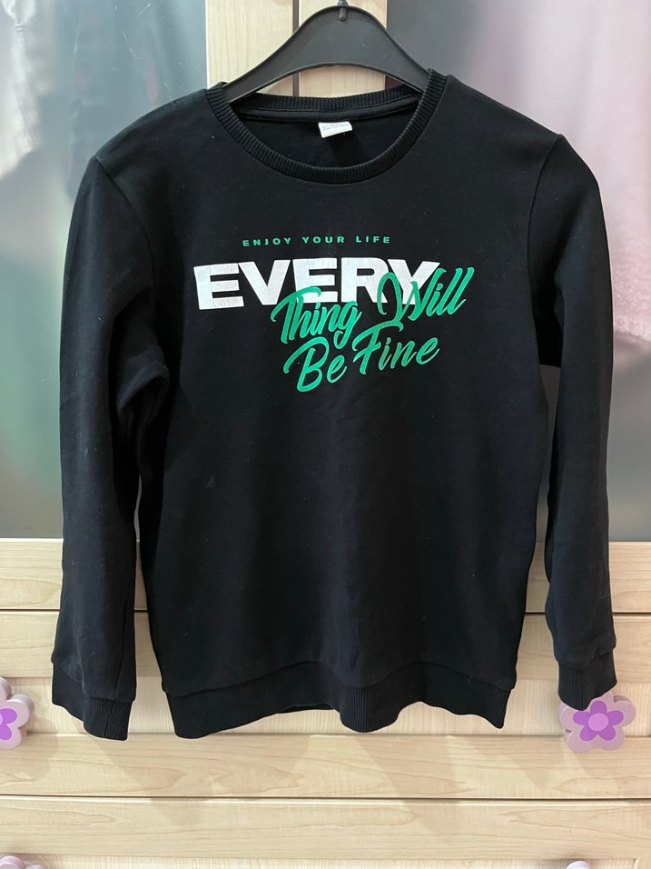 Siyah, uzun kollu, bisiklet yaka ve bol kesim sweatshirt. Ön yüzünde baskılı motive edici yazı bulunur. Yumuşak ve sıcak kumaştan, gündelik sokak giyimi için uygundur.