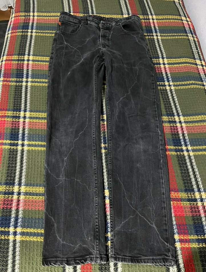 Batık desenli siyah denim erkek pantolon, kemerli ve normal boyda. Rahat kesimiyle günlük sokak stili için uygundur.