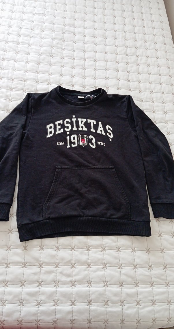 Siyah renkli, uzun kollu, yuvarlak yaka ve bol kesim erkek sweatshirt. Beşiktaş baskılı, örgü detaylı ve ön cepli. Rahat ve günlük stil için uygundur.
