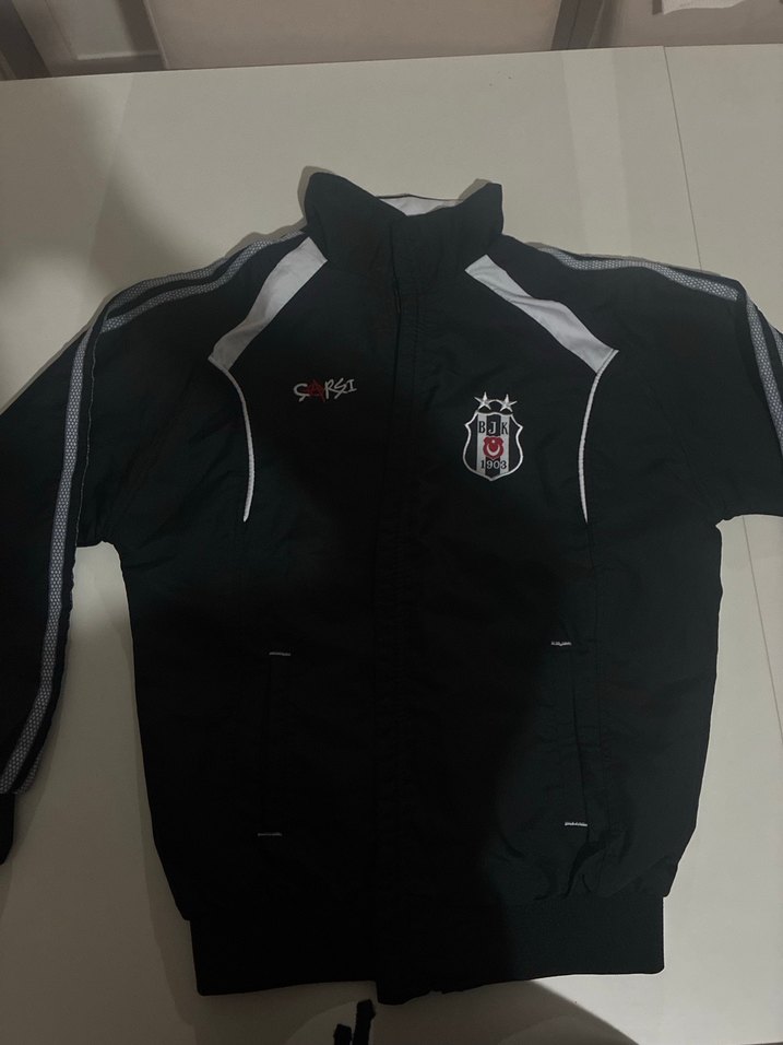 Erkekler için siyah spor ceket, dar kesim, bisiklet yaka ve uzun kolludur. Yumuşak fleece kumaştan yapılmış, normal boyda ve cırt cırt detaylıdır. Beşiktaş amblemi ve baskılı desenler bulunur, sportif ve gündelik sokak stili için uygundur.