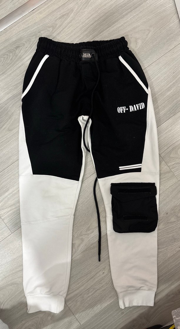 Erkekler için bol kesim, bel bantlı siyah-beyaz panelli OFF-DAVID baskılı, yumuşak kumaştan eşofman. Günlük rahat kullanım için uygundur. ️