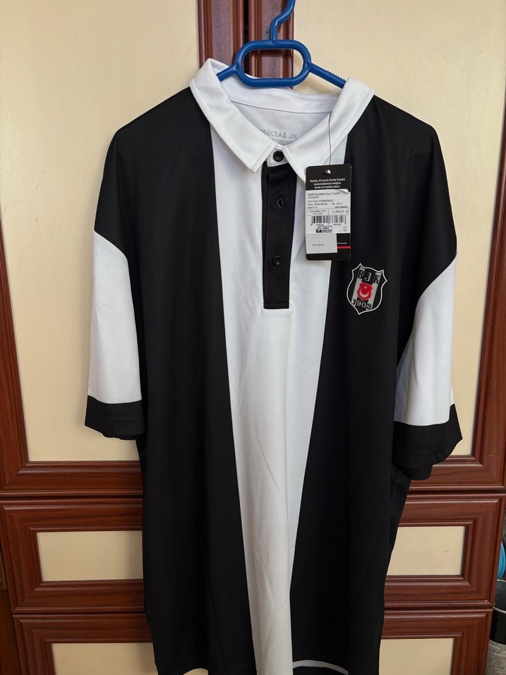 Erkekler için siyah-beyaz renklerde, düğmeli, kısa kollu, yakalı ve baskılı polo tişört. Rahat kesim ve yumuşak, sıcak kumaştan üretilmiştir. ⚽